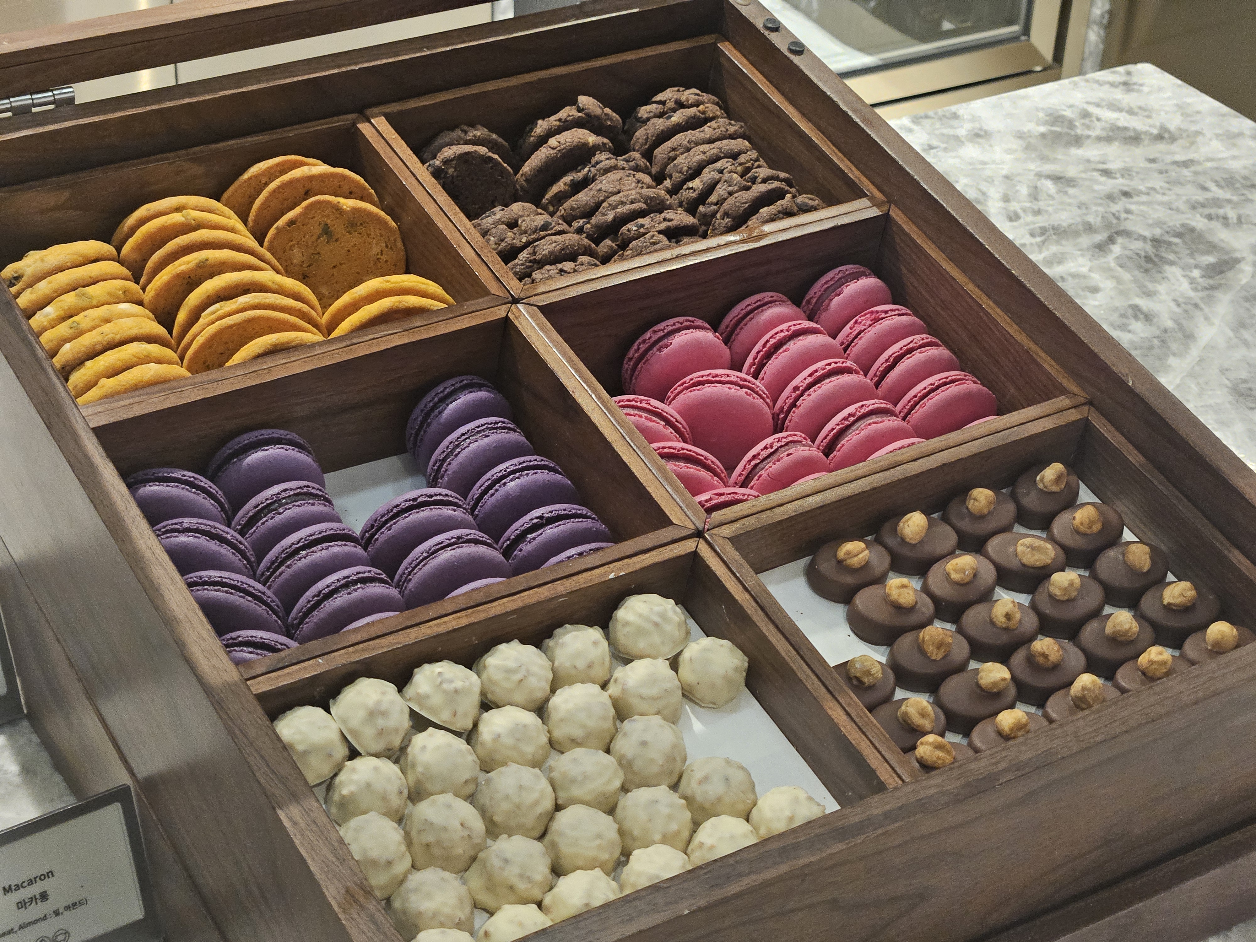 마카롱, 초콜릿, 과일, 견과류 등이 준비되어 있었어요.